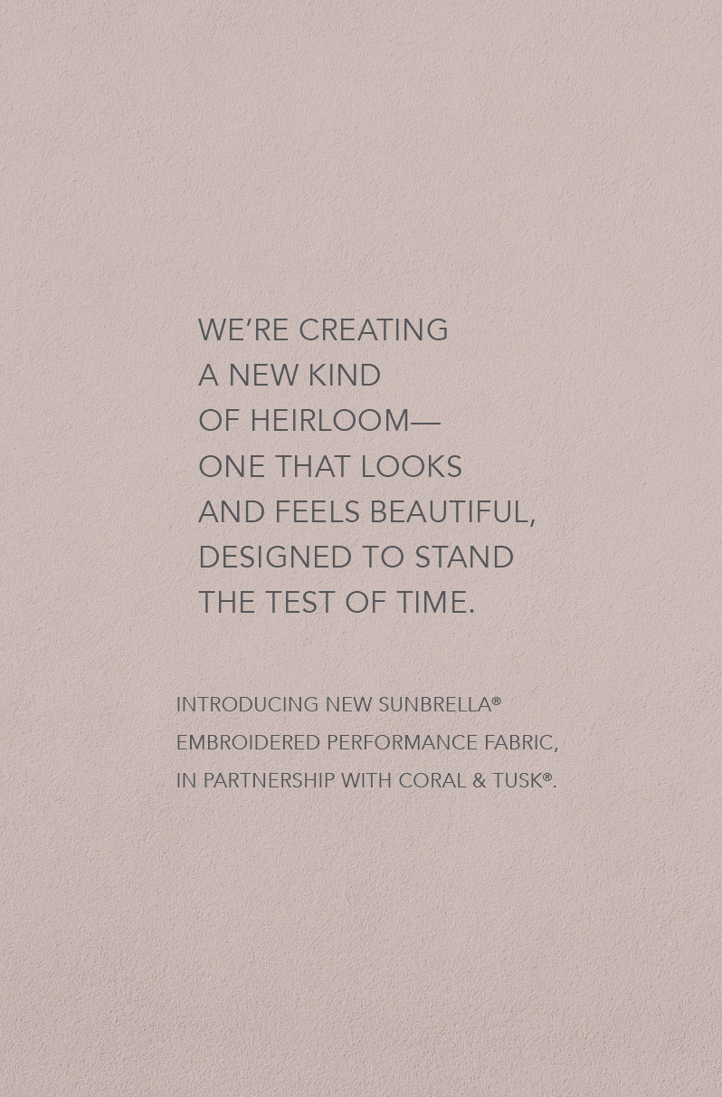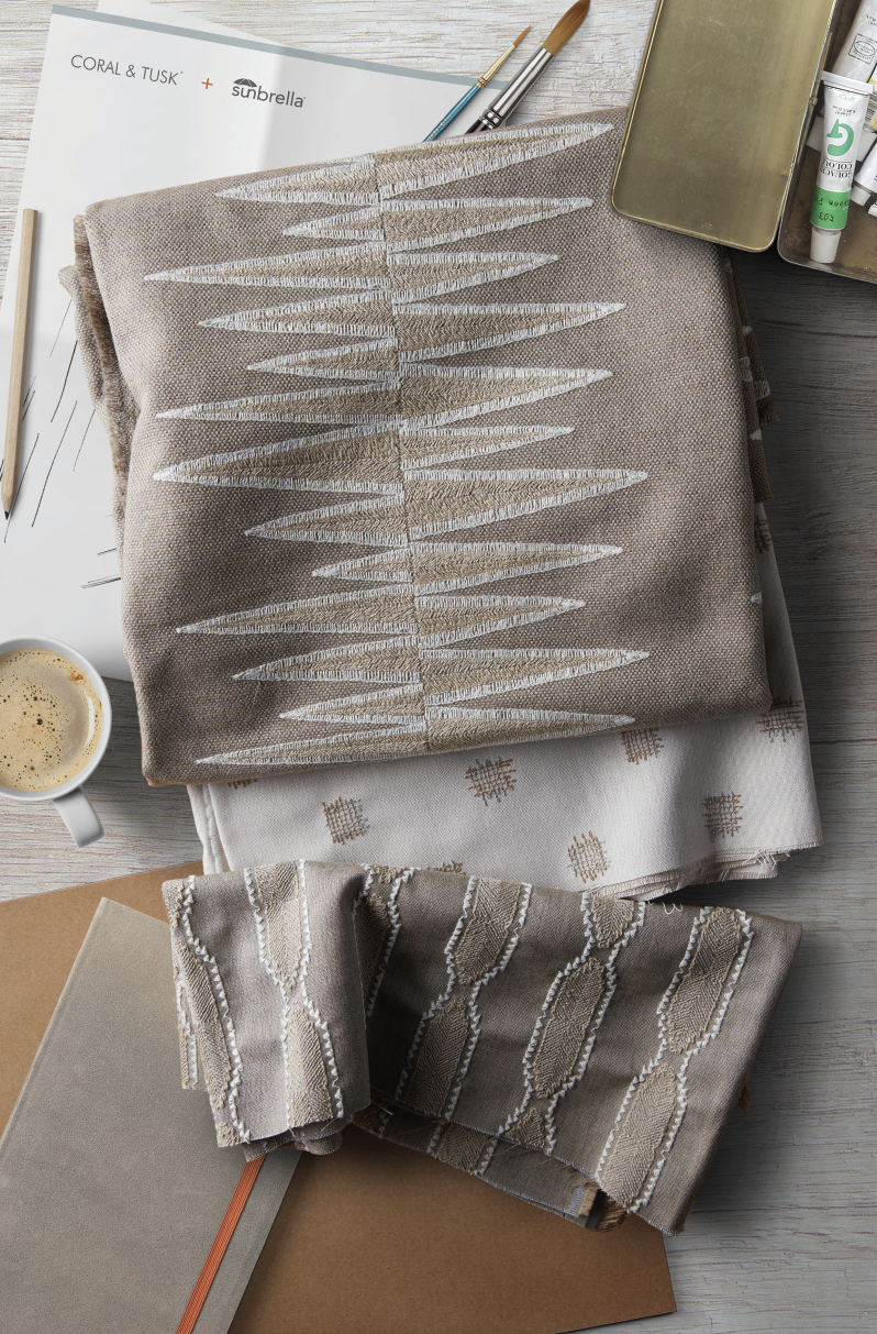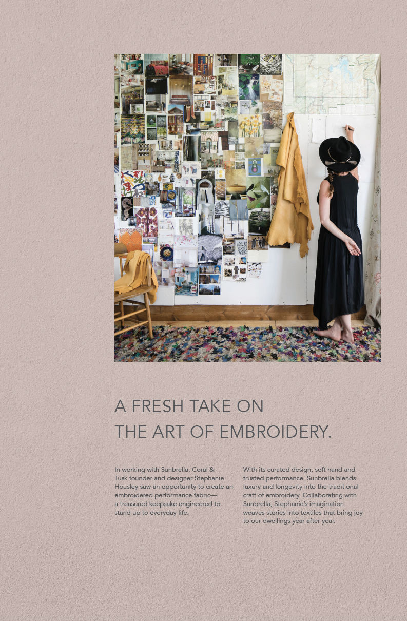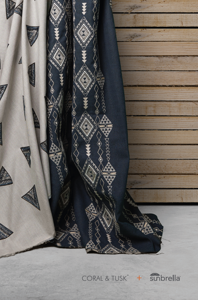 Coral & Tusk, an indie company that specializes in embroidered fabrics and keepsakes, partnered with Sunbrella to create a unique, heirloom-quality collection of embroidered Sunbrella performance fabrics.