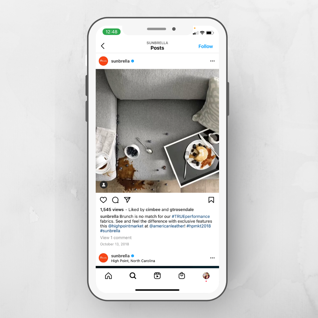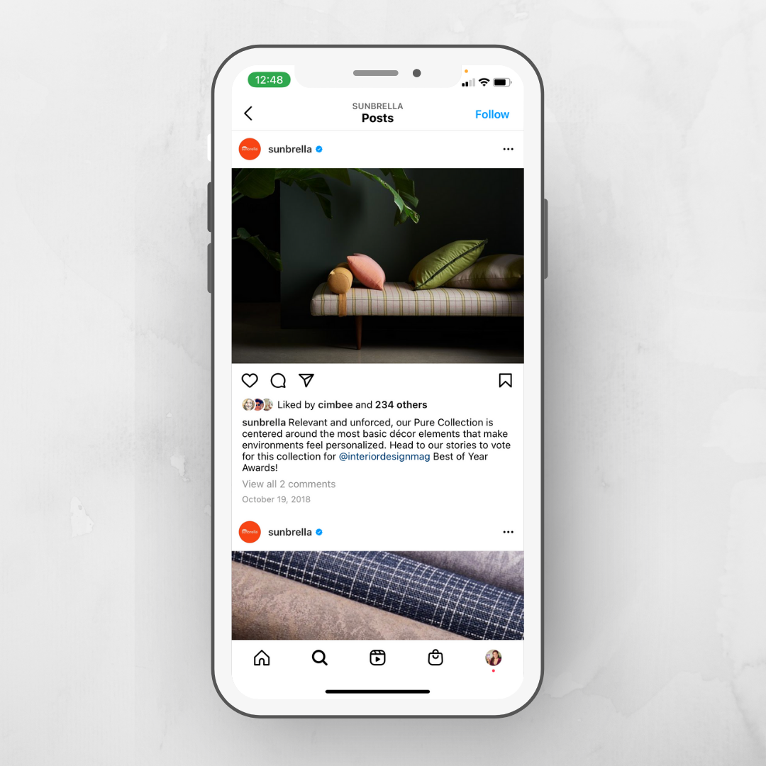 I often worked closely with the Sunbrella Social Media Specialist on social content, especially on Instagram, which has the highest levels of engagement. We used targeted hashtags and tagging in these posts to promote partnerships with our fabric partners, and to invite audiences to vote for Sunbrella in an annual contest.
