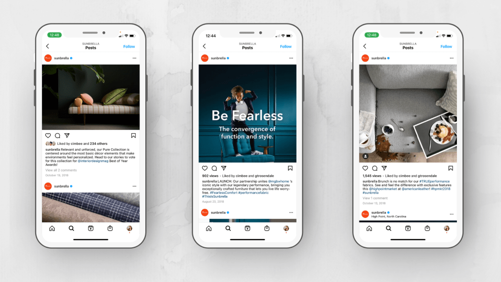 I often worked closely with the Sunbrella Social Media Specialist on social content, especially on Instagram, which has the highest levels of engagement. We used targeted hashtags and tagging in these posts to promote partnerships with our fabric partners, and to invite audiences to vote for Sunbrella in an annual contest.