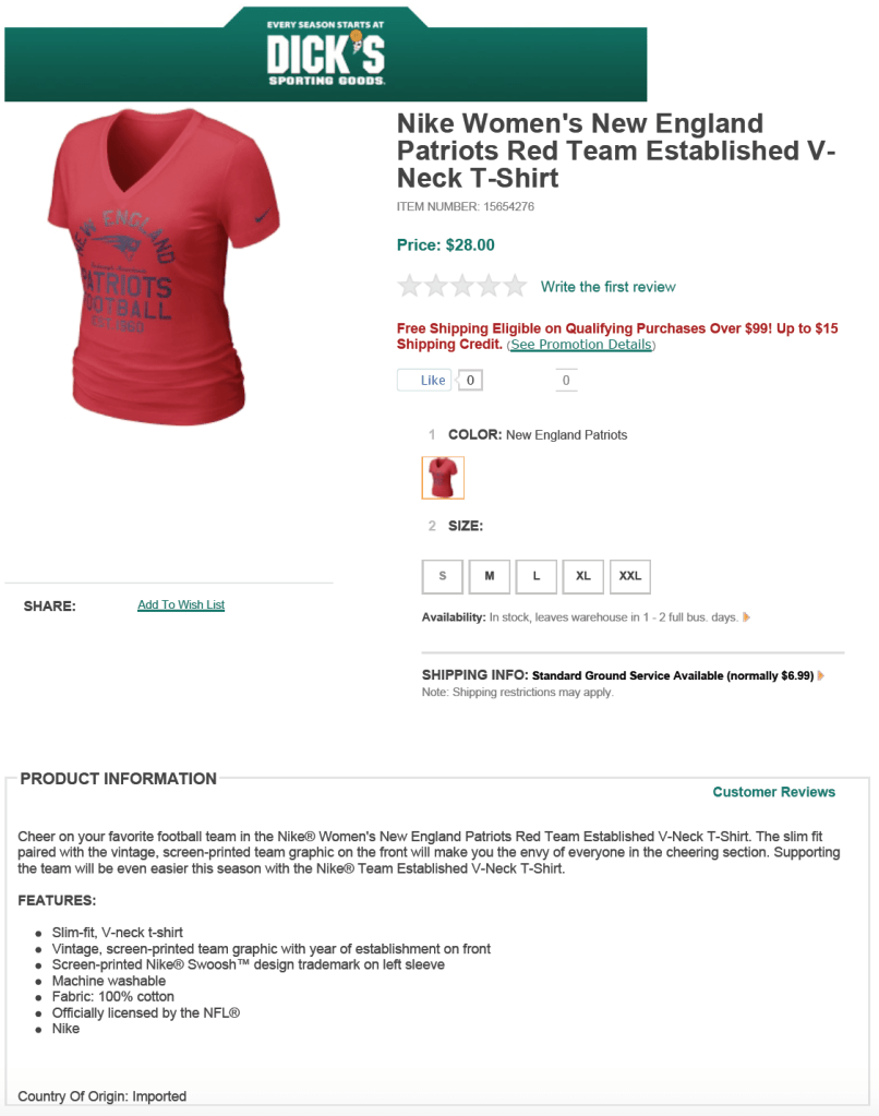 In Fall 2012 I contracted with Dick’s Sporting Goods in their Licensed Fan Gear shop (now called the Fan Shop), developing SEO-friendly product descriptions for MLB, NFL, NBA, NCAA and NHL products. We followed a fairly uniform formula to make sure the product detail page called out the team name + a clear, descriptive product name in the H1. The product description copy also needed to strike a balance between conveying sports enthusiasm while introducing important product details — important both because photography was generally limited to a single product image, and for screen readers.