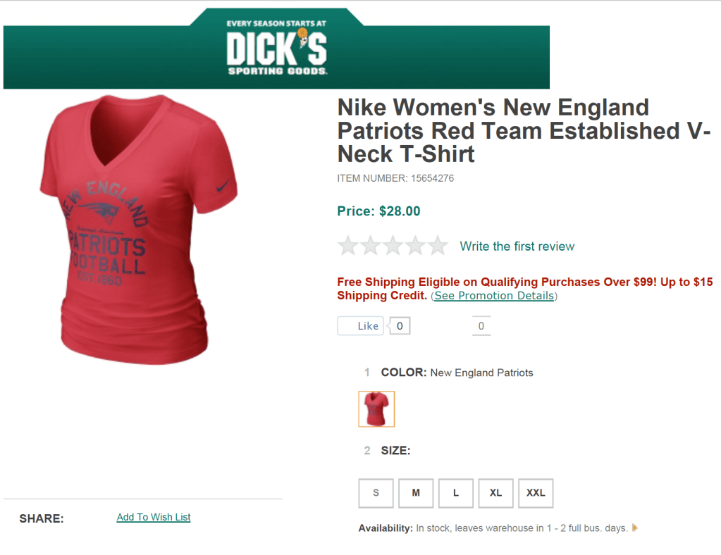 In Fall 2012 I contracted with Dick’s Sporting Goods in their Licensed Fan Gear shop (now called the Fan Shop), developing SEO-friendly product descriptions for MLB, NFL, NBA, NCAA and NHL products. We followed a fairly uniform formula to make sure the product detail page called out the team name + a clear, descriptive product name in the H1. The product description copy also needed to strike a balance between conveying sports enthusiasm while introducing important product details — important both because photography was generally limited to a single product image, and for screen readers.