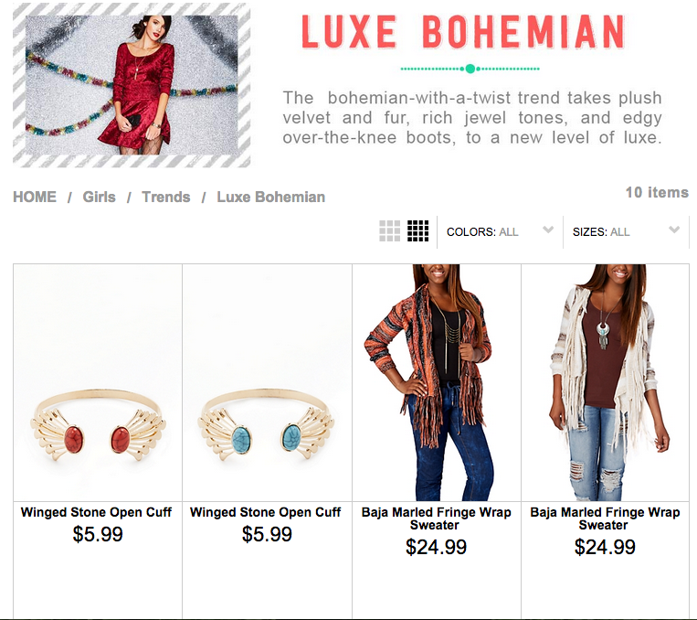 I was recruited to the teen fashion retailer rue21 in 2013 in order to help them launch their first e-commerce site, and in doing so I developed a brand standard and trained additional copywriters. rue21’s voice is young and playful, and branded content for them is always a balance of staying relevant while keeping the copy tight.