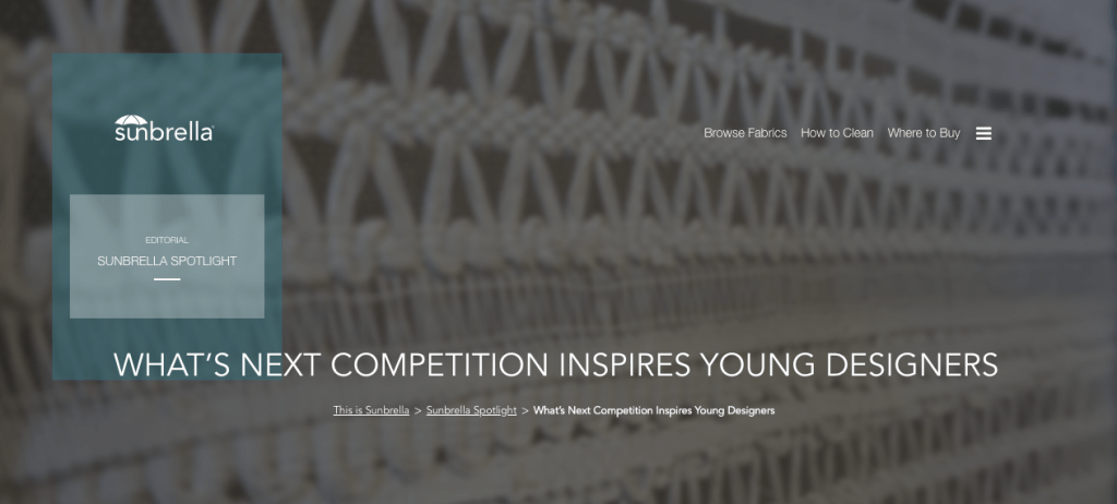 “This Is Sunbrella” is a consumer-facing blog, and gives Sunbrella the opportunity to highlight events and inspirational projects, and to comment on textile design. The post that I wrote below features the What’s Next competition, an event that Sunbrella hosts to tap into the creativity of young minds on the future of fabric design.