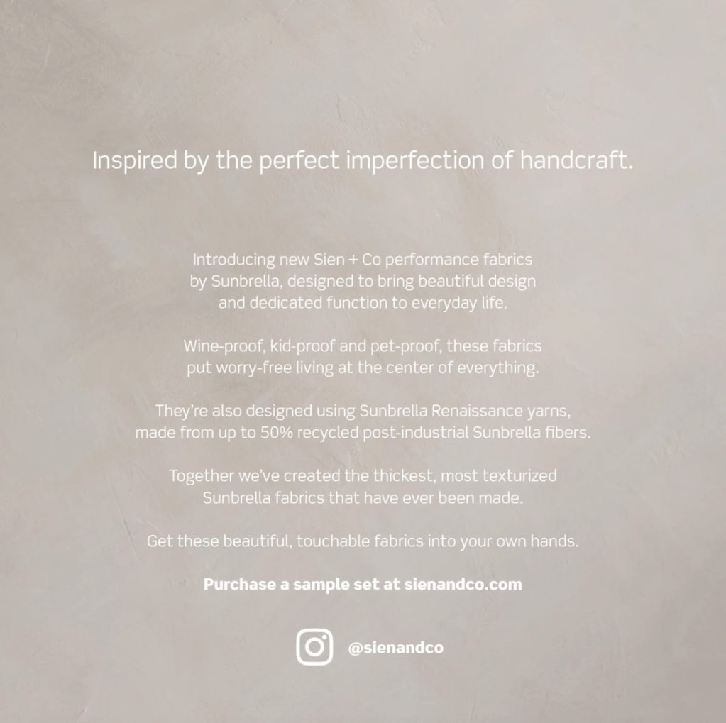Sien + Co is an indie brand who we had the opportunity to create a collection with that integrated Sunbrella Renaissance yarns–a special recycled yarn we make. With Sien + Co’s emphasis on “life-proof” fabrics that are backed by sustainable processes, I had a lot of fun bringing their cool, relaxed vibe into the copy for this postcard, created to feature at Maison & Object 2018, an annual international arts and home decor trade show that features Paris Design Week.