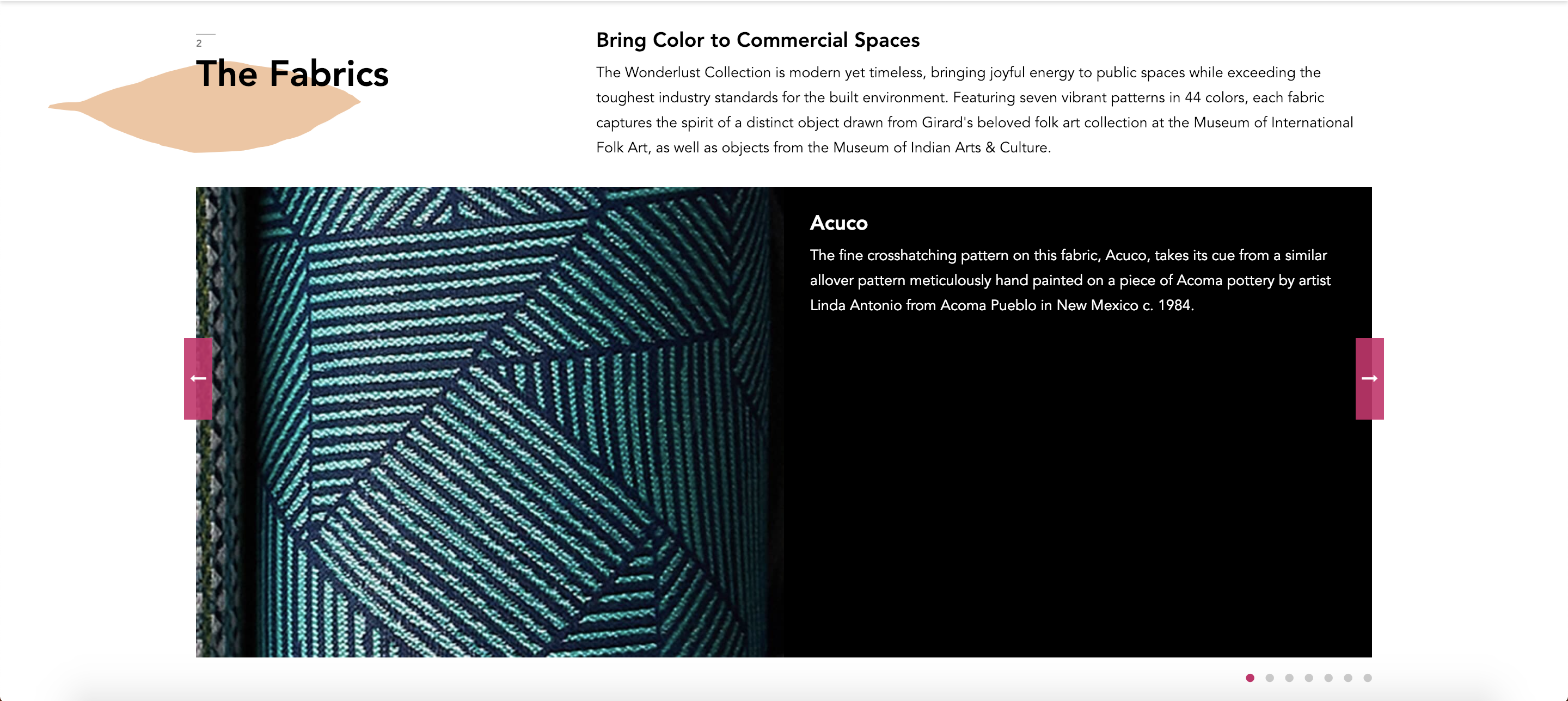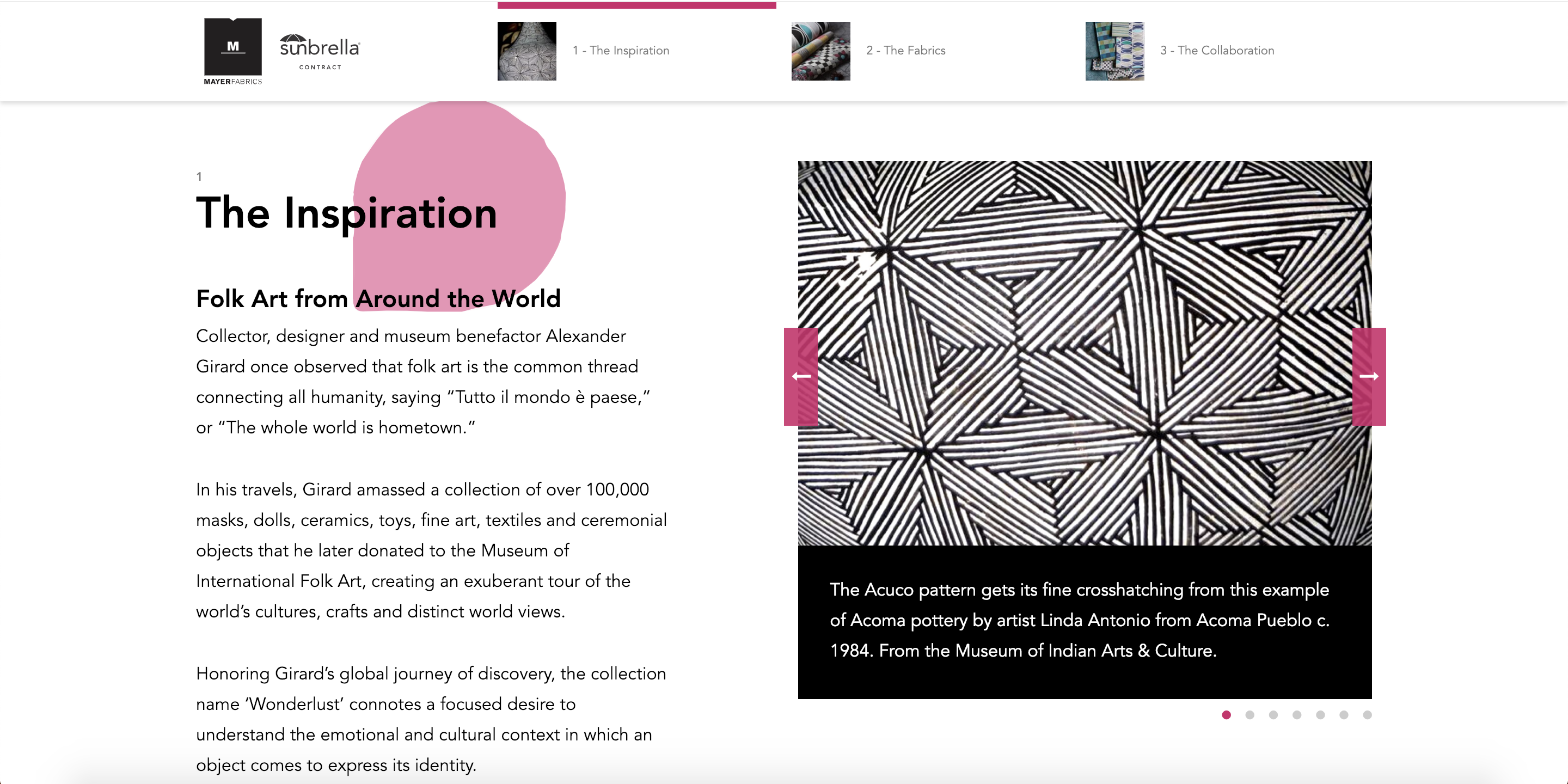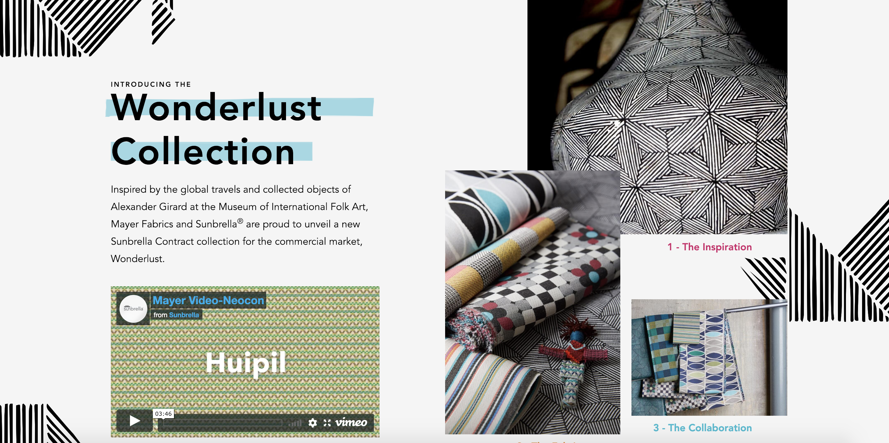 The Wonderlust Collection is a true partnership between Sunbrella Contract (Sunbrella’s commercial fabric brand), Mayer Fabrics and the Museum of International Folk Art. Together we collaborated to highlight this unique collection on a landing page, using the colorful global inspiration of the fabrics to guide the site’s look, feel and content.