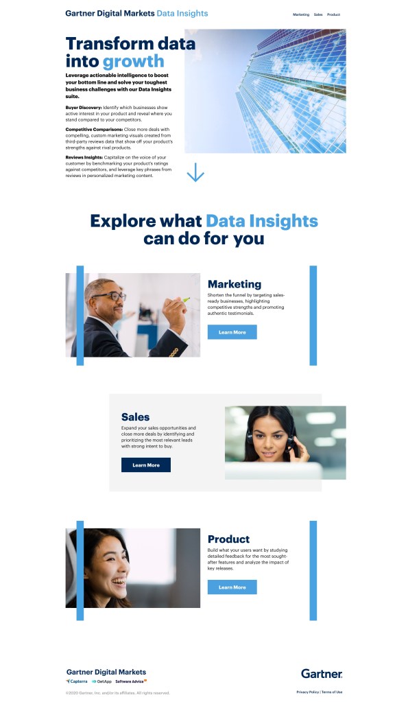 Putting ourselves in the shoes of the vendor audience we serve, we created a role-focused landing page to outline how the three products within Data Insights—Buyer Discovery, Competitive Comparisons and Reviews Insights—can help solve tough business challenges for three key vendor roles: Sales, Marketing and Product Development.