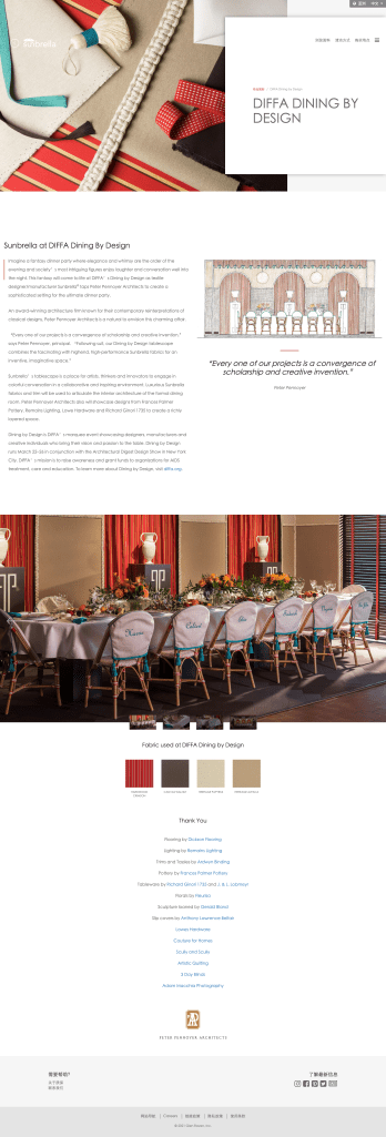 DIFFA is a nonprofit within the design industry whose mission is to raise awareness and grant funds to organizations for AIDS treatment, care and education. In collaboration with the firm Peter Pennoyer Architects, Sunbrella created an elaborate tablescape setting for their annual fundraiser, Dining by Design.